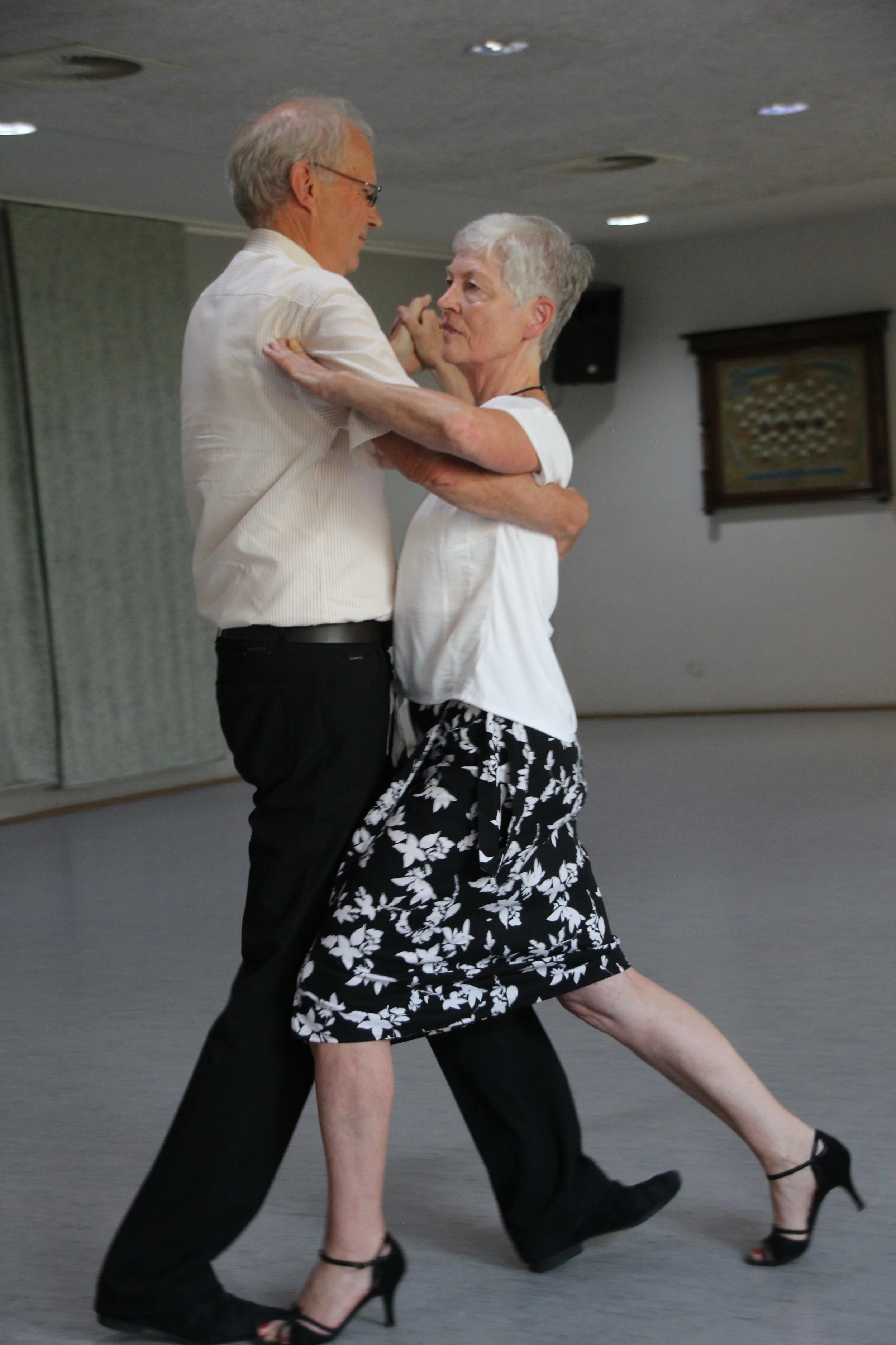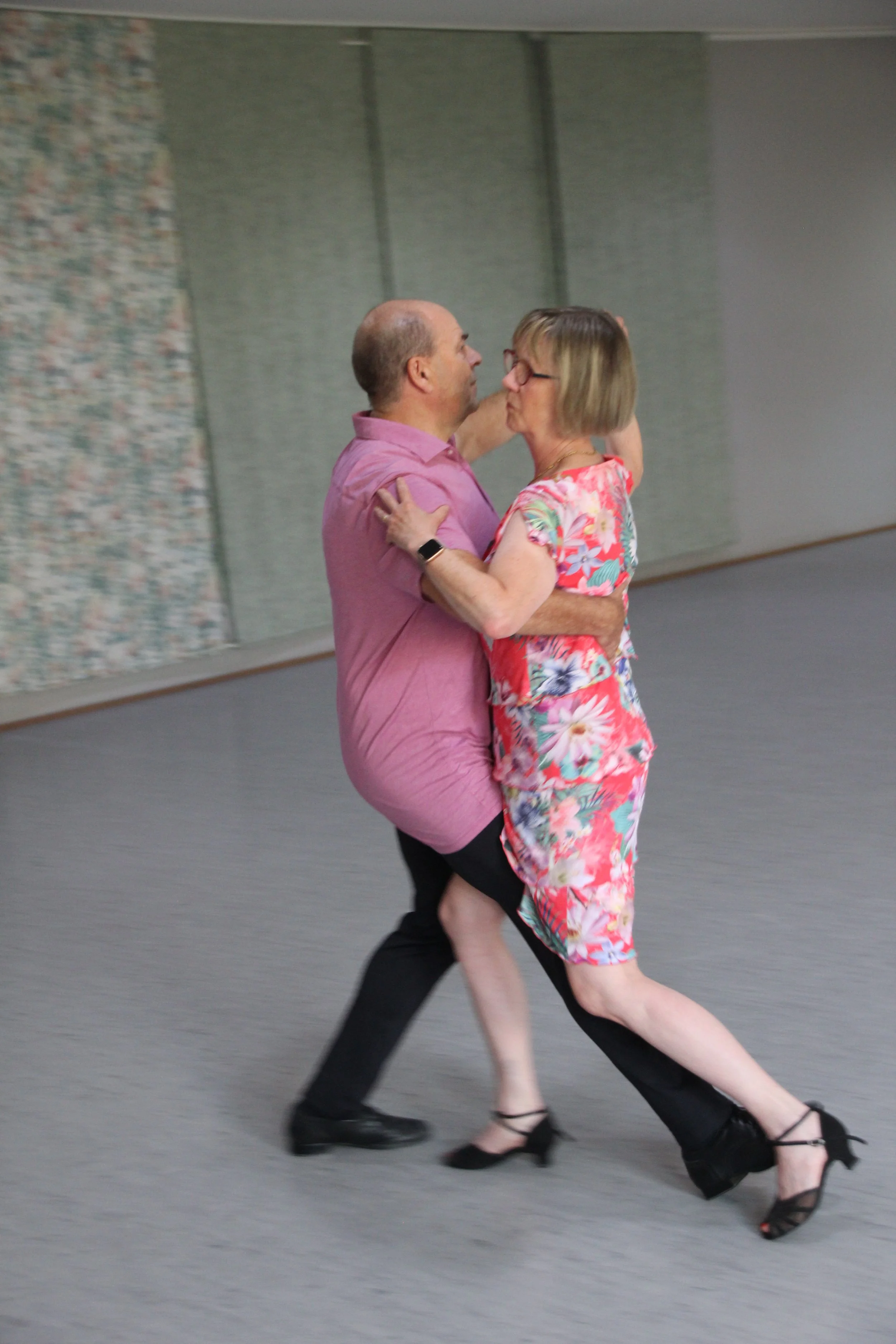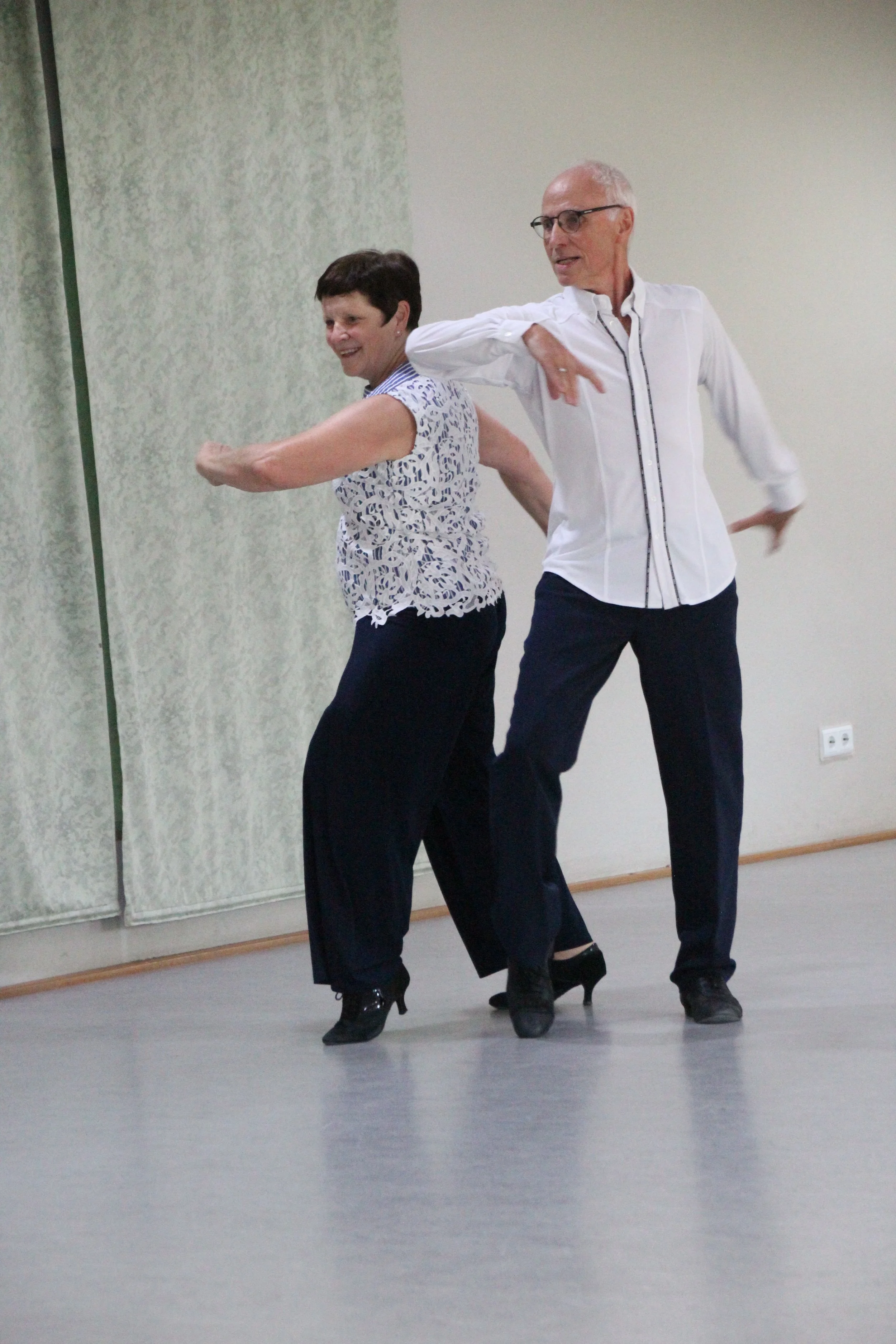 Heike fand, wie immer, die passenden Worte zur Begrüßung und zum Beginn der Abnahme; Brigitte und Herbert Schmidt haben dann in ihrer gewohnten ruhigen, wohlwollenden und durchaus auch unterstützenden Art die einzelnen Tänze abgenommen. Ein gewisses Lampenfieber war bei allen wahrnehmbar, was aber keineswegs schlecht ist, erhöht es doch die Aufmerksamkeit. Aufkeimende Nervosität kann mit einem Schluck aus der Wasserflasche (Kirschwasser muss es nicht sein) und mit dem Einsatz eines Schweißtuchs bekämpft werden. Auch wenn man es im Vorneherein nicht glauben mag, das Tanzen vor den Augen von Brigitte, Herbert und allen anderen hat tatsächlich Spaß gemacht. Auch wenn der Takt einmal nicht getroffen wurde oder eine nur suboptimal ausgeführte Figurenkombination den Tanzfluss stoppte, war dies kein Beinbruch und hat Gnade vor den Schmidtschen Augen gefunden. Sehr schön war es feststellen zu können, dass wir alle Paartänze gesehen haben, die bei den Trainings der Tanzsportabteilung geübt werden; d. h. alle Standard- und Lateintänze, alle Tänze des Tango Argentino (Tango, Vals und Milonga) sowie Discofox, Salsa und Westcoastswing. Auch war bei allen Paaren eine große Begeisterung für das Tanzen festzustellen.